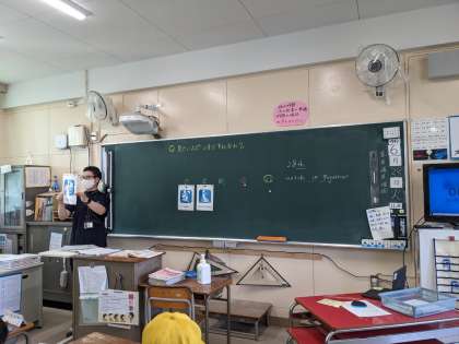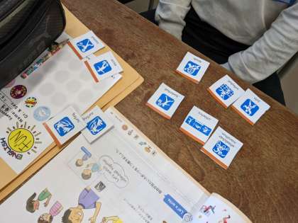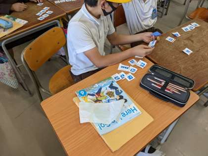 外国語の授業でラッキーカードゲームをしました。ペアで何のスポーツを見たいか質問し合いながらカードを引き、得点を競いました。点数が発表されるたび、子どもたちからは「よっしゃー」「うわー」と叫び声があがりました。