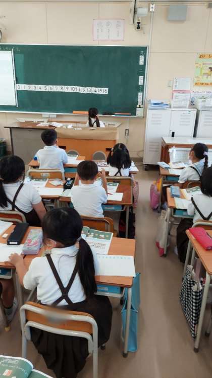 算数科では、「10をこえるかず」について学習しています。この日の学習では、20までの数を並べて、並び方を見て何か気づくことはないかを考えました。定規のように並んでいることや1ずつ増えていることなど、色々なことに気づいていました。