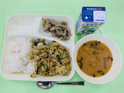卵と鶏肉の丼を「親子丼」といいますが、牛肉の場合、他人丼になります。今日は、牛肉のほかにたまねぎやにんじん、青ねぎなどたっぷりの野菜をだしで煮て味つけし、卵でとじています。ごはんにかけるメニューは食べやすく、子ども達もよく食べていました。