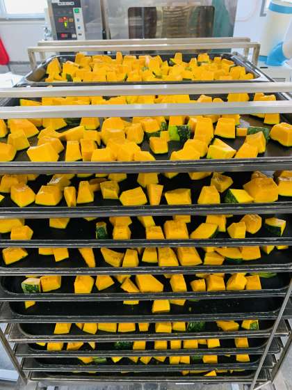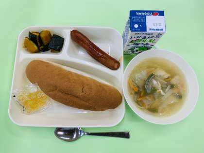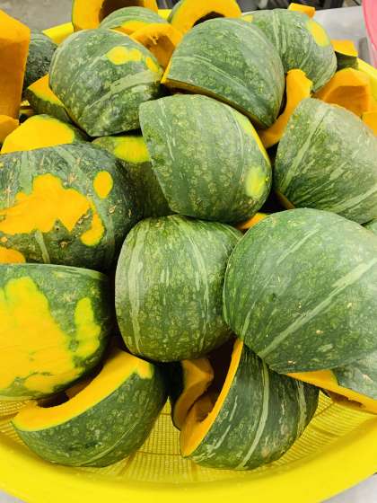 焼きかぼちゃは、給食調理員さんが生のかぼちゃの種を取り、スプーンにのせられるくらいの大きさに包丁で切っています。塩をふって蒸し焼きにするシンプルなメニューでしたが、かぼちゃの甘みが感じられ、おいしい!の声がたくさん聞こえてきました。