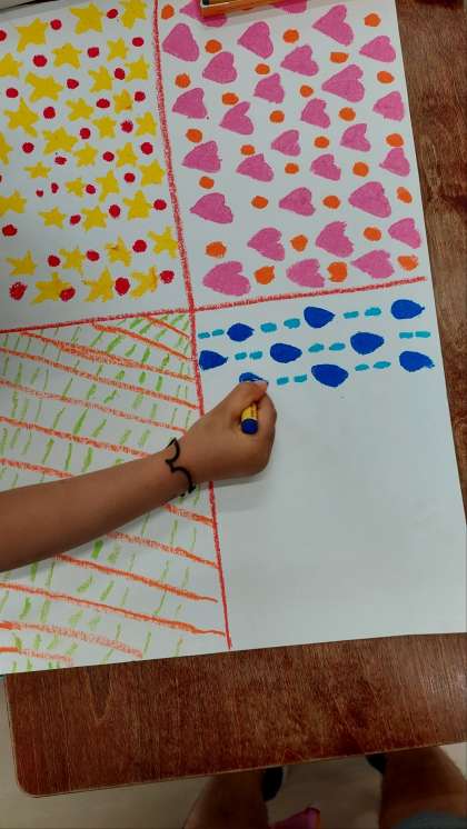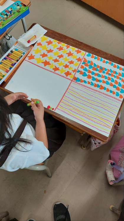 図画工作科の学習で、自分で色々な模様を考えて描いています。三角や丸、ハート、星といった記号で作られた模様や線を組み合わせて作られた模様など、自分で色々と考えて模様を描いていました。