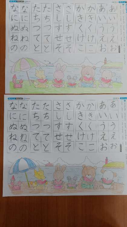 2学期初めての書写をしました。お手本の字をなぞったり、お手本の字を見ながら丁寧に書きました。1学期より、どの子も字が丁寧になり、集中して取り組めるようになっています。色塗りのところも、はみ出さずに塗ろうと意識している子がたくさんいました。