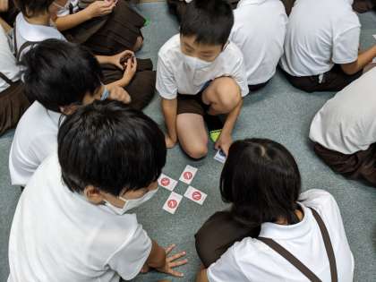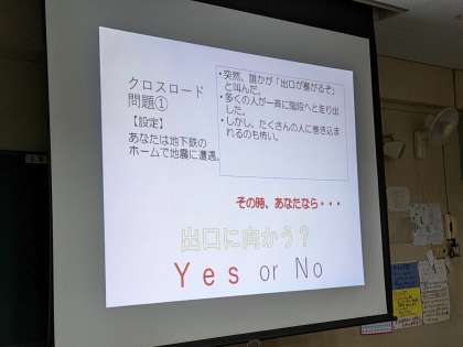 防災学習では地震などの災害が起こったときどのように行動するか考えました。また、クロスロードゲームでは、災害時の場面で自分はどっちの行動を選ぶのかグループで話し合いました。