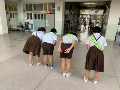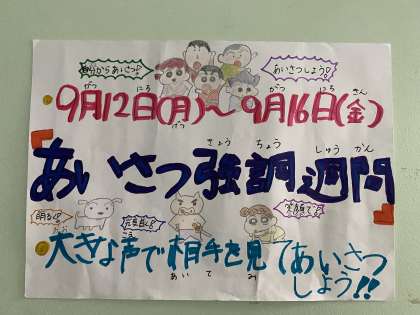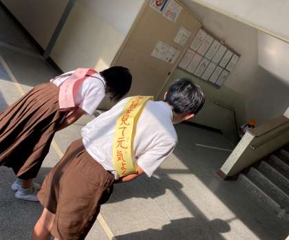 今週はあいさつ強調週間です。運営委員会の児童が、手作りのたすきをかけて校内であいさつ運動に一生懸命取り組んでいます。
