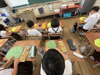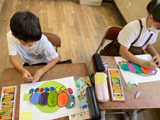 ハサミを使って、イモムシの形や葉っぱの形を切り取りました。