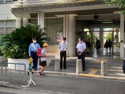 本日は、見守り隊の皆さんの激励と子ども達の見守りのため、東淀川区長・東淀川警察署長はじめ区役所の方々、警察署の方々が早朝よりお越しくださいました。