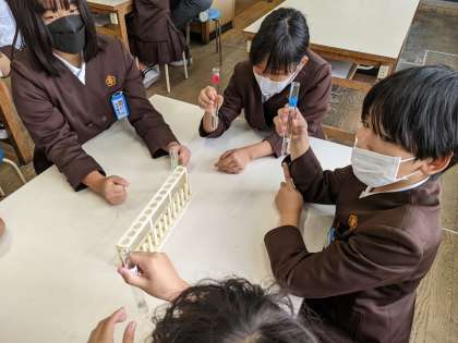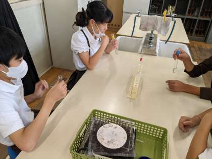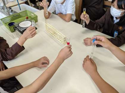 実験の様子です。見た目や臭いを嗅いで違いはあるのか調べています。中には臭いがきつい水溶液もあったようで「うわっ!!」といいリアクションを見せていました。