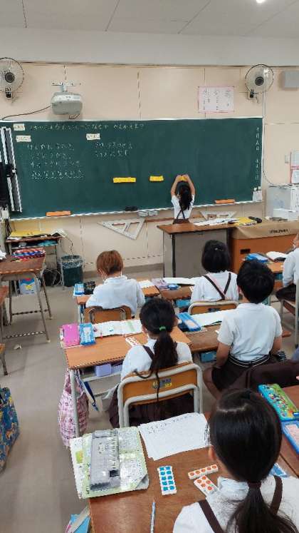 算数科では「3つのかずのけいさん」を学習しています。前から順に足すと、3つの数の計算もできることを学びました。