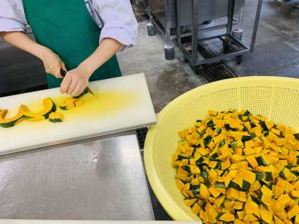 給食室では、生のかぼちゃを一口大に切り、だし、砂糖、みりん、こいくちしょうゆを入れてくずれないようにコトコト煮込み、あずきを加えています。昔から食べられてきた和食の一つです。