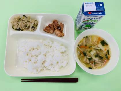 鶏肉のチリソースは、しょうが汁、にんにく、ケチャップとトウバンジャンなどで味つけした鶏肉を、焼き物機で焼いています。今日は、切干しだいこんにもラー油を使用したり、焼き豚をスープに入れたりと、中華風のメニューでした。