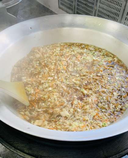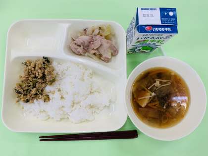 ソーキ汁は、沖縄県の代表的な料理です。ソーキとよばれる豚の骨つきあばら肉と、だいこん、こんぶなどをかつおぶしで煮込んだ汁ものです。給食では、一度豚ばら肉をゆでて脂を落とし、柔らかく煮ています。
