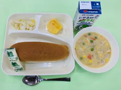 今日のクリームシチューは、乳アレルギーの子どもでも食べられるように、豆乳を使い、ルウのとろみは小麦粉の代わりに米粉を使用しています。豆乳でもコクがあり、好評でした。柿は、「初めて食べたけどおいしかった〜!」という声をたくさん聞きました。初めての食材は、ご家庭でも試してくださいね。
