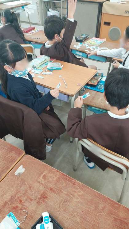 算数科では「たしざん」を学習しています。今日は、たしざんカードを使ってペアでゲームをしました。互いに問題を出しあったり、大きさ比べゲームをしたりしました。家でも練習しているからか、計算が以前よりも早くなっていました。