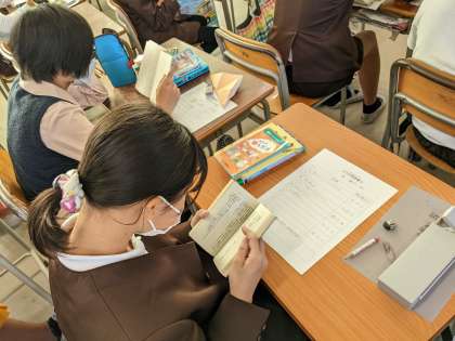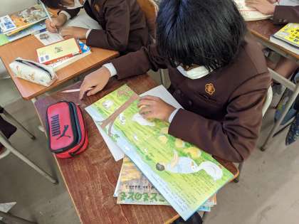 3分間読書の様子です。ブックトークで紹介してもらった本や教科書に出てくる物語に関係する本、歴史の本などにも興味を持って読んでいました。