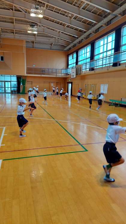 体育の学習で、なわとびをしています。前とびや交差とびなど、様々なとびかたを練習しました。なわとびの結び方も教えたので、一人で結ぼうと頑張っていました。