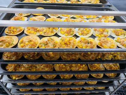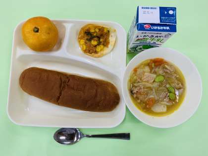 変わりピザは、ぎょうざの皮を使った、一人1個の手作りピザです。具にはツナ缶やコーン、チーズなどを使い、焼き物機でカリッと焼いています。作業は大変ですが、子ども達に人気のメニューです。