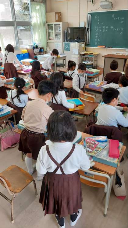 今日は、テスト返しの後に少し時間があったので、お道具箱や机の中を班の人同士で確認しあった後、中を整理しました。整理しなくても綺麗に片付いている人やプリントが何枚もでてくる人など、様々でした。今日で、みんな綺麗に片付いたので、それを維持できるように頑張ろう♪