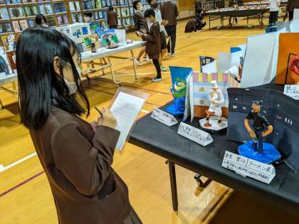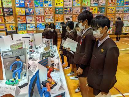 作品展の観賞をしました。友達の作品を見て「すごい!!」「めっちゃリアル」と褒め合っていました。