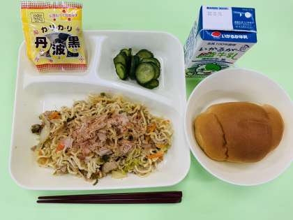 給食では、ソース味やオイスターソース味などの焼きそばの他に、今日のようなしょうゆと塩、こしょうで味つけした和風の焼きそばも人気のメニューです。