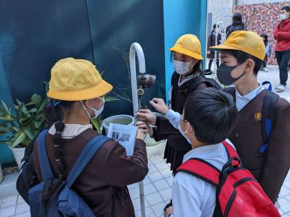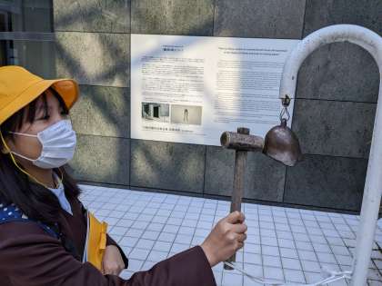 友だちと一緒に見学しています。刻の庭では平和を願って鐘を叩きました。