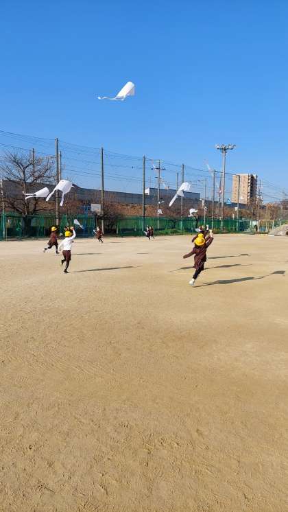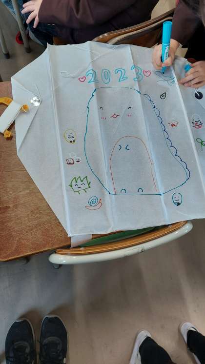 生活科の時間に昔遊びとしてたこあげをしました。たこにペンや色鉛筆などで絵を描いた後、運動場に出てたこあげをしました。みんな、とても楽しそうにしていました。