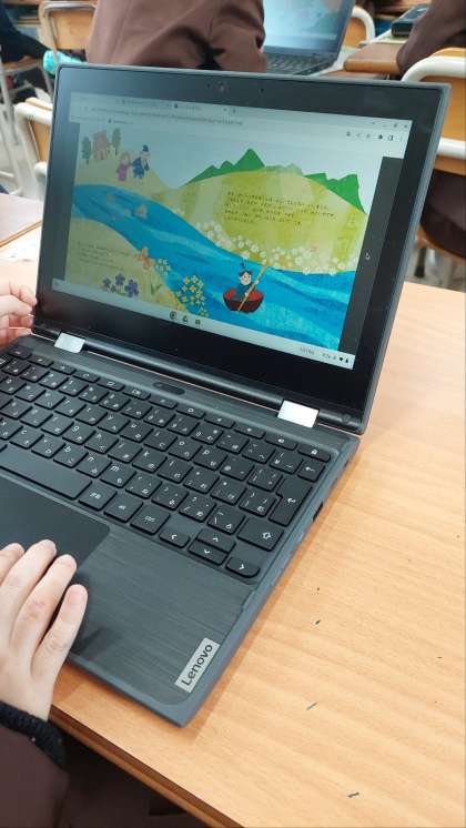 国語科の「むかしばなしをたのしもう」の学習では、昔話の読み聞かせを聞いたり、タブレットを使って、色々な昔話を読んだりしました。