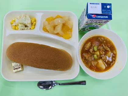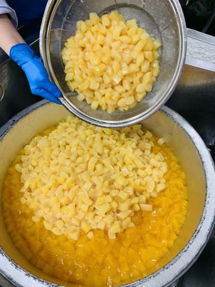 今日のフルーツゼリーは、みかんが入ったゼリーと白桃の缶づめを給食室で混ぜています。子ども達に大人気でした。