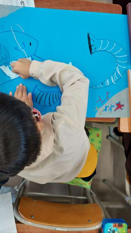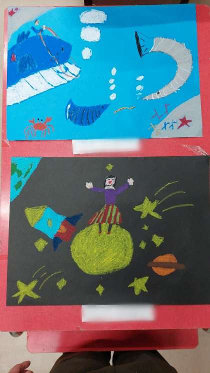 図画工作科の学習で「どんなものにのりたいかな」を描きました。自分でどんな乗り物に乗りたいかやその周りの様子を考えて、絵に表しました。くじらやロケット、雲、虹など様々な乗り物に乗っている絵を描いていました。