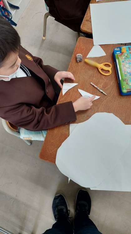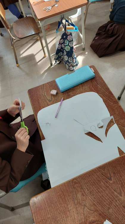 図画工作科では「紙版画」をしています。1年生では、鬼を作っています。今日は、顔と角、目を作りました。大きさに苦戦しながらも、一生懸命に取り組んでいました。