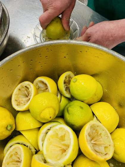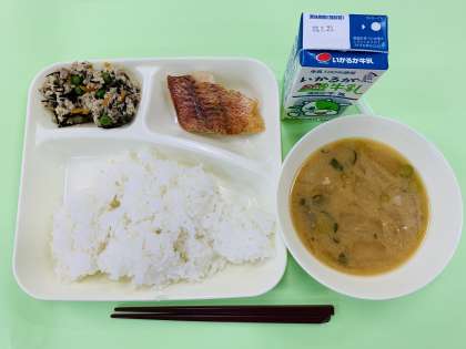 レモンじょうゆかけは、今が旬の国産(広島県産)レモンを一つひとつ絞り、酒、みりん、うすくちしょうゆと合わせたタレを作って、焼いた赤魚にかけています。レモンは酢の酸味よりもさわやかで食べやすく、子ども達にも大好評でした。