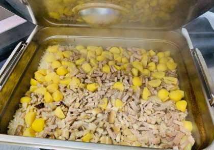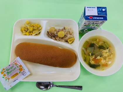 中華おこわは、もち米を使い、栗や焼き豚などと調味液をバットに入れて、蒸し焼きにしています。ごま油の風味で、食欲が増す献立です。