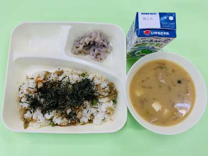 鶏ごぼうご飯は、鶏ひき肉やごぼう、にんじんなどをだしで煮、砂糖、塩、こいくちしょうゆで味つけした具をごはんにかけ、自分で混ぜていただきます。給食では、低・中・高学年で米の量が違いますが、混ぜご飯などはさらに10gの減量米飯になり、低学年で60グラム、中学年で70グラム、高学年で80グラムの米を使用しています。