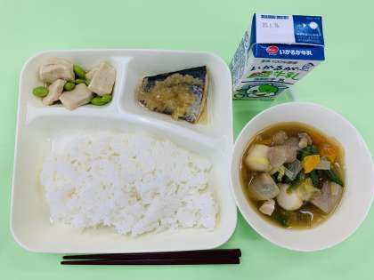 さごしとは、さわらの小さいもの(体長40〜50センチメートル)をいいます。今日はしょうが汁と料理酒で下味をつけて焼いた後、だいこんおろし、みりん、うすくちしょうゆを合わせたタレをかけています。ごはんが進むメニューで、子ども達に大人気でした。