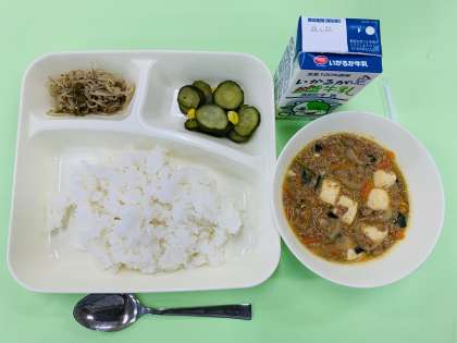 給食では、不足しがちな野菜を摂れるように献立が作られています。今日のメニューのマーボーどうふにも、たまねぎやにんじん、にらが入っていました。ご家庭でも、配布されている献立表を、夕食作りなどの参考にしていただければと思います。