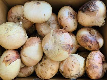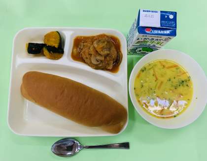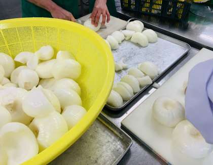 給食では、季節ごとにおいしい食べもの(旬の食べもの)がたくさん登場します。今日は、新たまねぎを紹介します。新たまねぎは、収穫したものを乾燥させずにすぐ出荷しているため、やわらかく、みずみずしいのが特長です。今日は、煮こみハンバーグのソースに使っています。