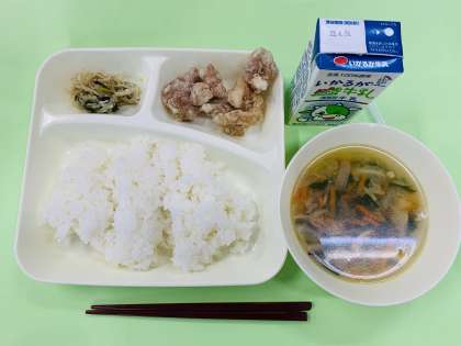 大人気のからあげ、今日は、しょうが汁、にんにく、塩、こしょうで下味をつけ、でん粉をまぶして油で揚げています。どのクラスも、食缶はからっぽでした!