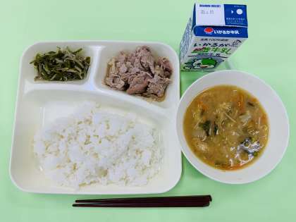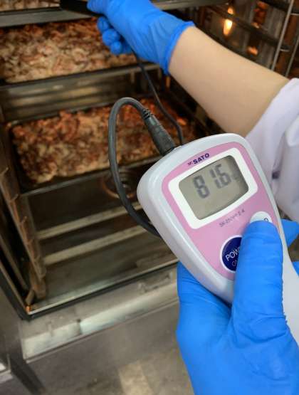 学校給食では、安全なものを提供できるよう、衛生管理を徹底しています。その一つが、中心温度の測定です。できあがりの温度を測り、75度以上(二枚貝等は85度以上)あるかを確認して、提供しています。写真は、しょうが焼きの温度を測定しているところです。