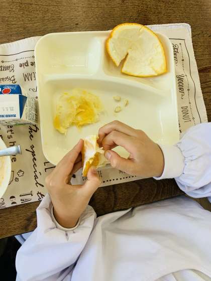 そして、今が旬のあまなつかんも登場しました。皮をむくのはむずかしいですが、ご家庭でも指先を使って、旬のくだものを食べる機会を作ってほしいと思います。