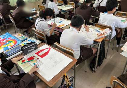 グラデーションで背景を塗ったり、様々な方法で立体感を出したりしながら、それぞれが思い描く町を表現しています。