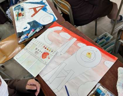 図工では、自分の名前のアルファベットを使って「町」を描いています。