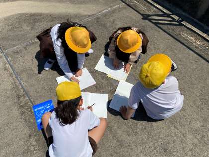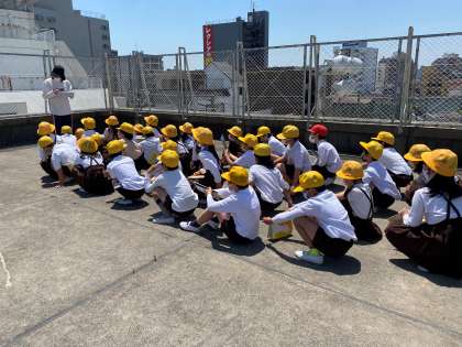 社会科の学習では、方位の学習のために校舎の屋上に行きました。