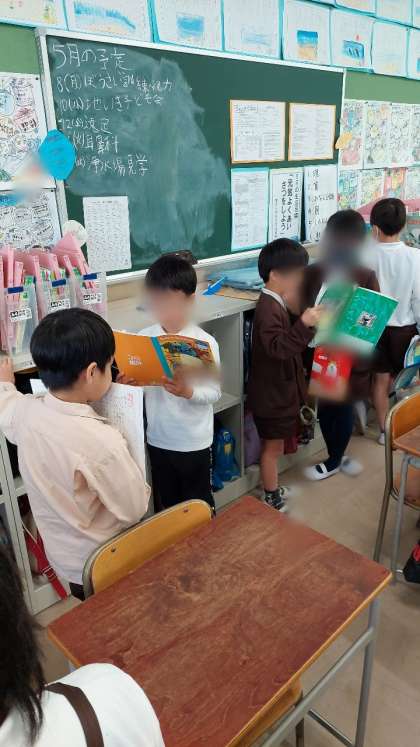 国語科で「ヤドカリとイソギンチャク」を学習しています。初めて読んだ感想を書いたあと、書き終わった人同士で書いた感想を伝え会いました。