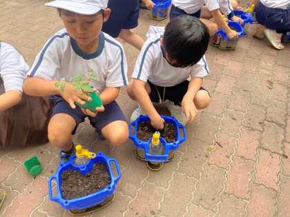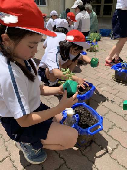 ミニトマトの苗を植えました。優しく苗を自分の植木鉢に植えかえました。