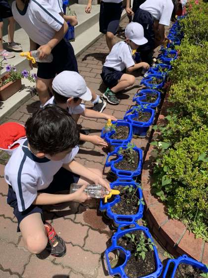 ミニトマトの苗を植えてからたっぷりと水をあげました。「大きくなーれ!!」