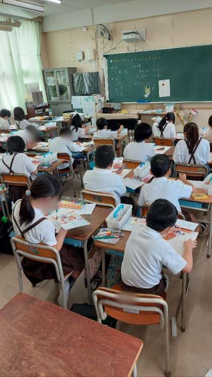 図画工作科では「たけのこ」を作成しています。赤、黄、青を混ぜながら、色作りをして塗りました。全て同じ色ではなく、濃い色の部分や薄い色の部分などの違いも意識しながら塗りました。