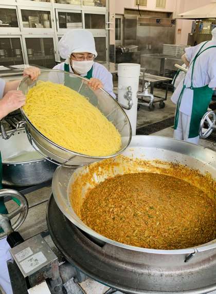 カレースパゲッティは、豚ひき肉やベーコンなどと野菜をいため、カレールウの素、こいくちしょうゆなどで味つけしています。スパゲッティは別で固めにゆでたあと、いためた具の中に入れ、さらにいためています。とても重たい作業ですが、子ども達の「おいしかったよ!」の声に、疲れもふきとぶ給食室です。