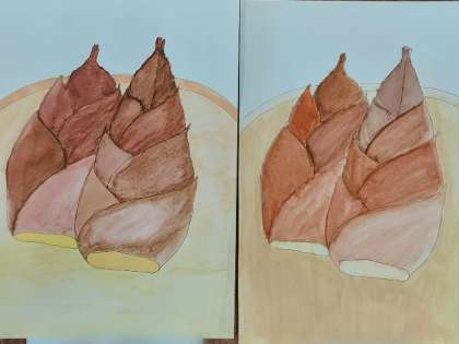 図画工作科の時間に作成していた「たけのこ」の絵が完成しました。なかなか思いどおりの色が作れずに、悩みながら取り組んでいる子もいましたが、みんな最後まで集中して取り組んでいました。