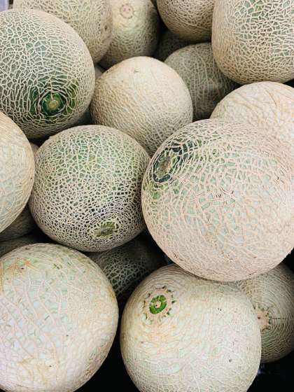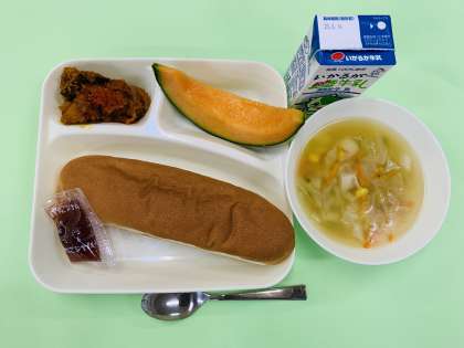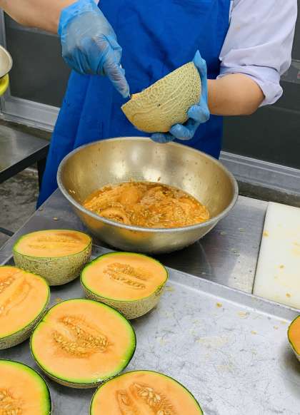 クインシーメロンは、茨城県から届きました。給食室で半分に切った後、種を取り、さらに4分の1に切って一人8分の1切れずつ数えています。さわやかな甘みがあって、水分もたくさん摂れるくだものです。