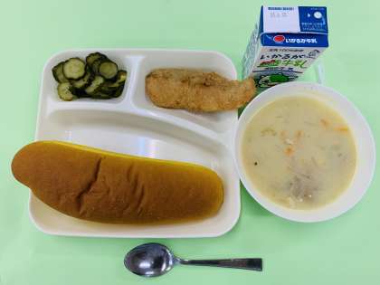 豆乳は、大豆を原料にしたものです。大豆をすりつぶして絞った液体は豆乳としてとうふやうすあげ、あつあげなどに加工し、絞りかすは「おから」として料理に使います。今日は野菜やベーコンなどを入れた洋風のスープに豆乳を入れています。