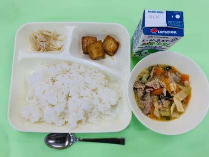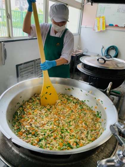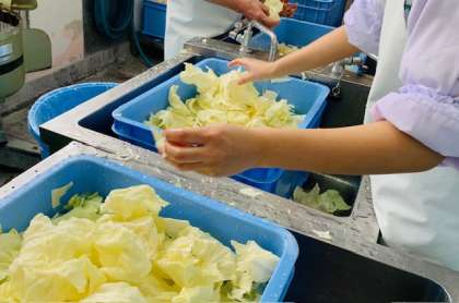 給食室では、キャベツなど葉の野菜は、給食室で一枚一枚はがして、ていねいに洗っています。今日は、中華煮にたっぷりキャベツが入っていました。